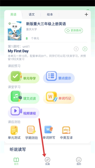 进入英语学习页面后,点击底部的【拓展】选项,进入拓展板块,就能看到锻炼身体、知识拓展等相关功能。