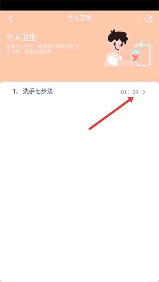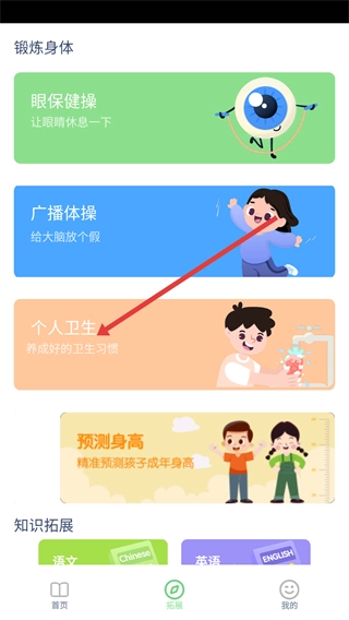 在拓展板块中,点击【个人卫生】选项,即可进入个人卫生学习页面,进而了解与卫生习惯相关的内容。