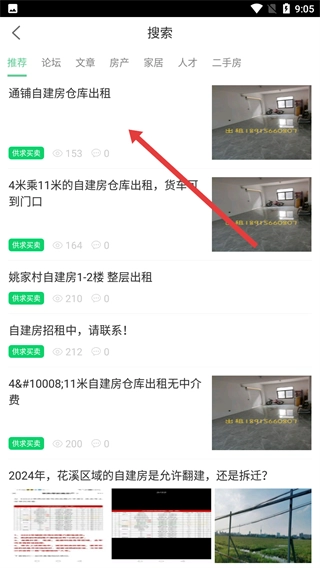 在【搜索结果】页面里,浏览各种类型的条目,像【通铺自建房仓库出租】这类,挑选自己感兴趣的内容点击进入查看。