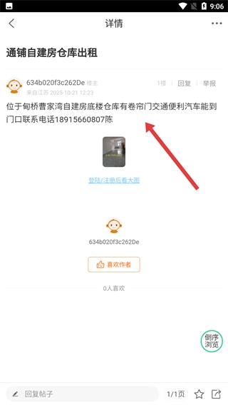 进入【详情页面】后,就能看到像【通铺自建房仓库出租】这类信息的具体内容了,其中包含位置、联系方式等信息。