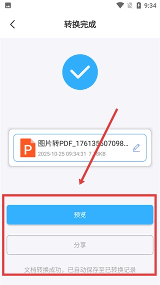 转换完成后,你可以点击【预览】按钮查看转换后的PDF文件,也能使用【分享】功能进行分享,而且文档会自动保存到转换记录里。