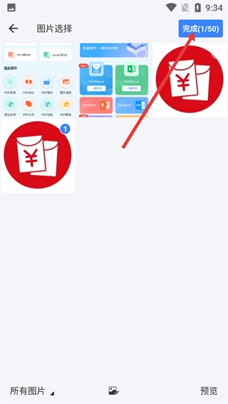 在【图片选择】界面选定待转换的图片后,点击【完成(1/50)】按钮,即可确认图片选择操作。