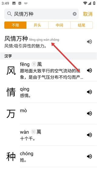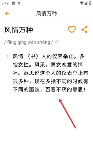 进入成语详情页后,就能查看【风情万种】的释义,知晓它的意思是形容人的仪态举止有着多样的风姿韵味,大多用来指女性,让人看多少次都不会觉得厌烦。