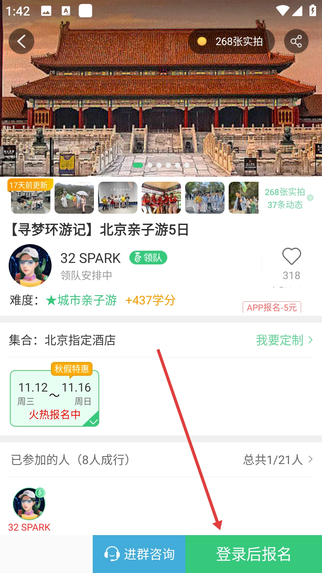 在详情页点击【登录后报名】按钮,即可完成该旅游产品的报名流程。