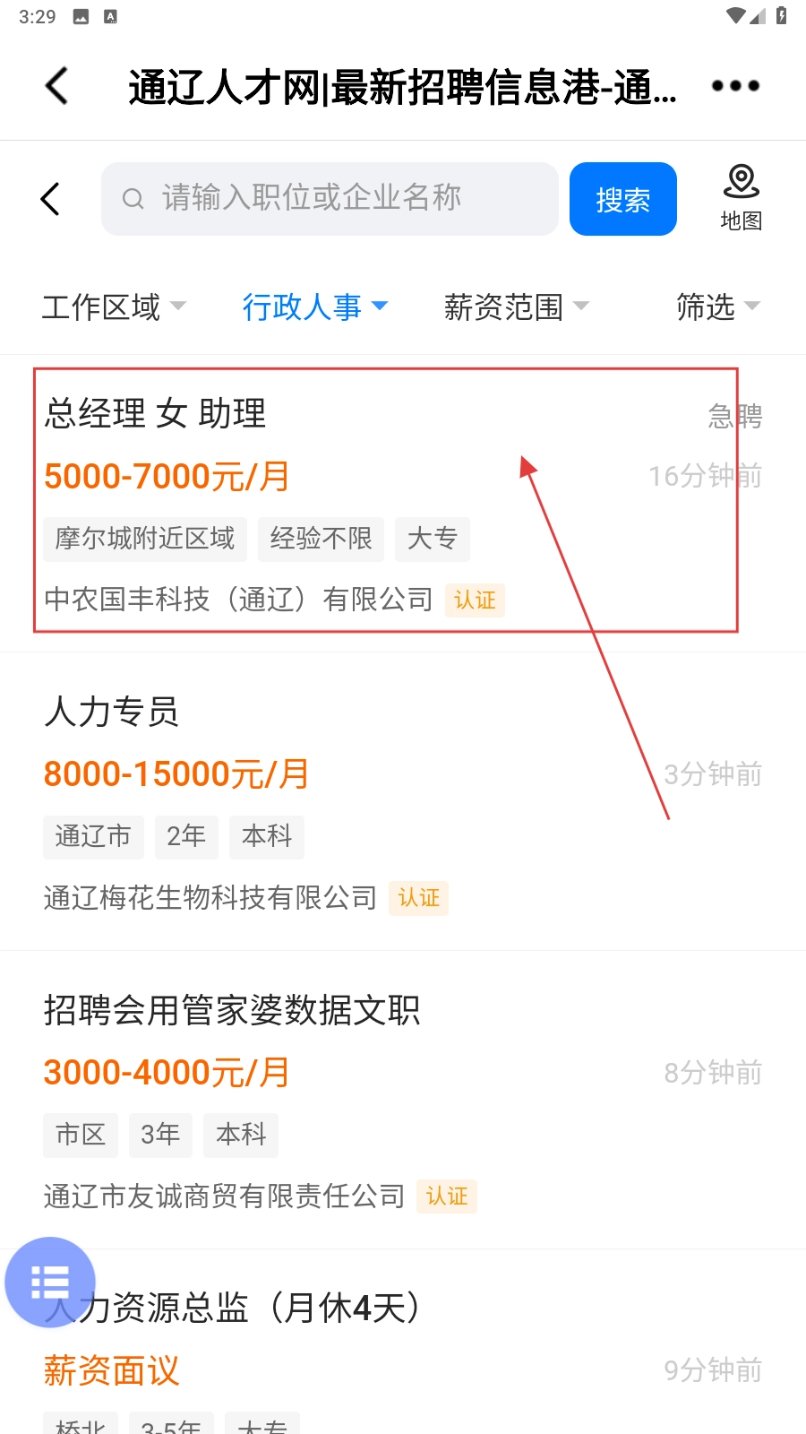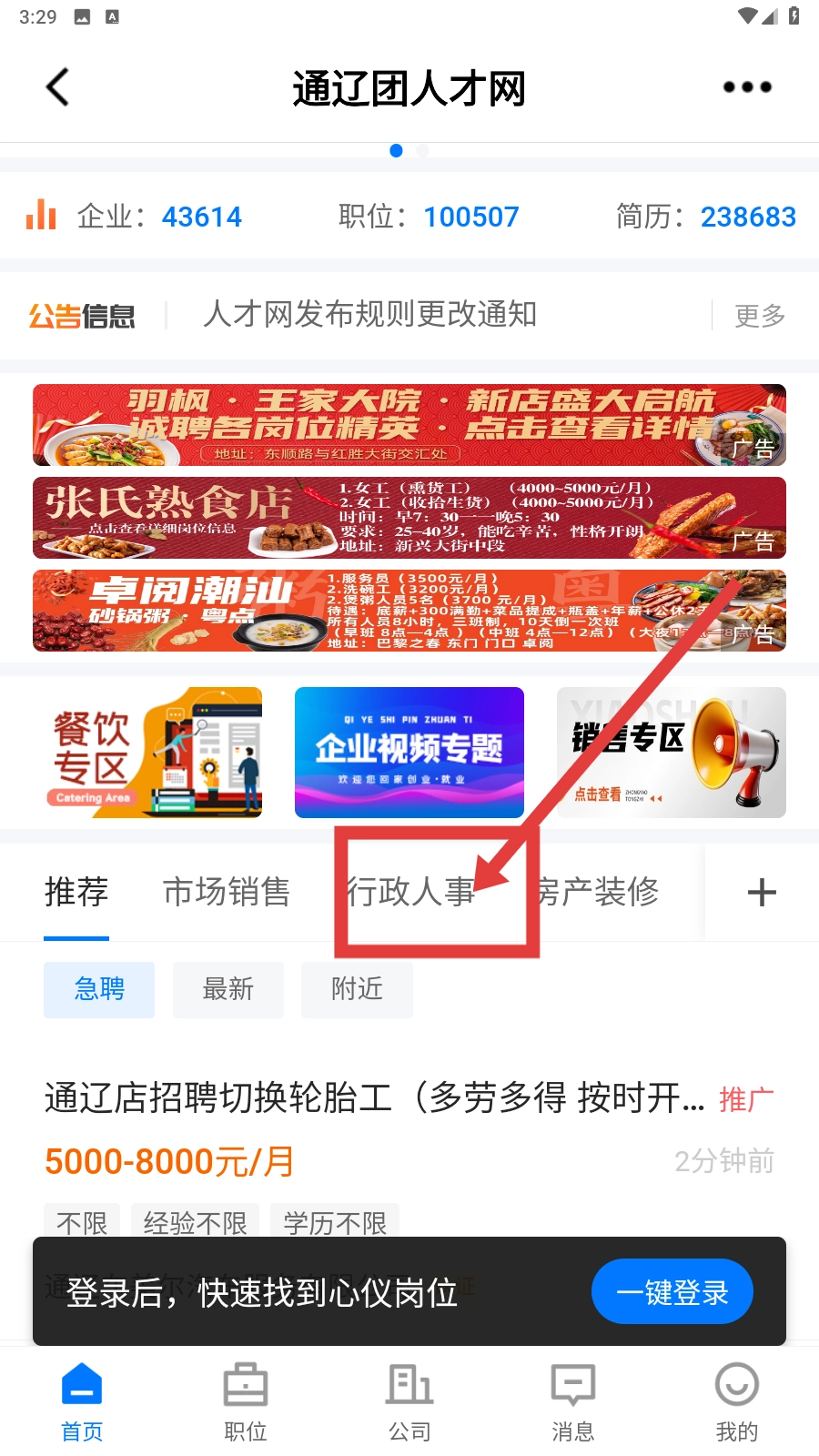 在人才网页面,点击【行政人事】分类标签,即可查看相关的招聘岗位信息。
