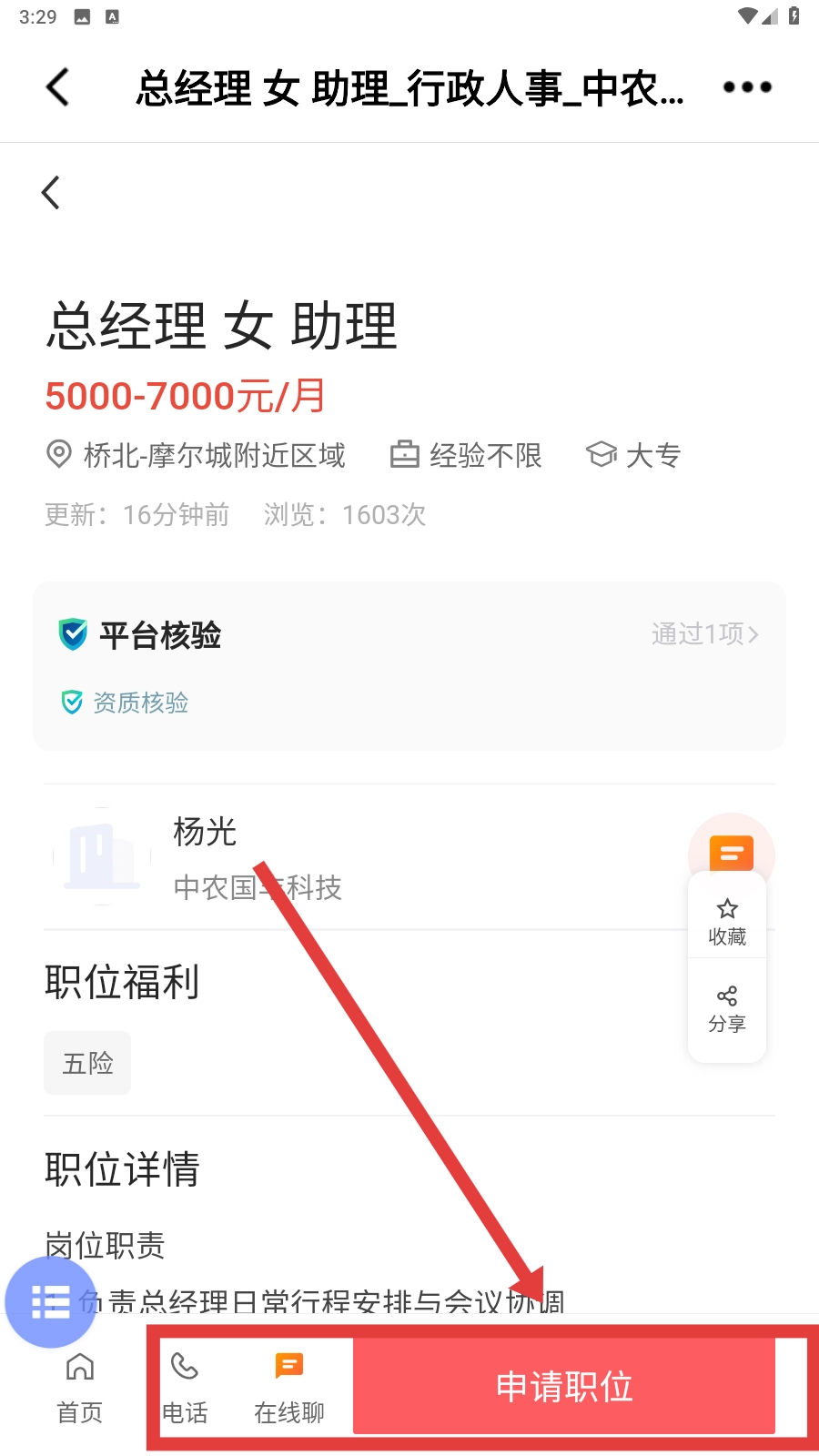 在岗位列表中,点击【总经理女助理-岗位名称】这一选项,即可进入该岗位的详情页面。