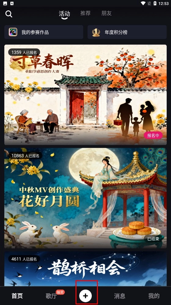 点击底部中间的【添加功能按钮】,即可进入与创作相关的页面。