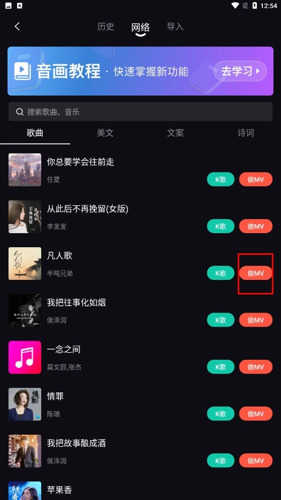 在页面里找到目标歌曲,点击它右边的【做MV】功能按钮,就能进入MV的制作环节了。