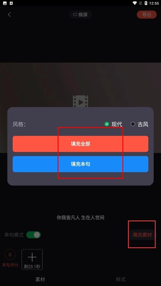 在制作页面,你可以选择【填充全部】或【填充本句】按钮,也能点击【填充素材-功能按钮】来添加素材。