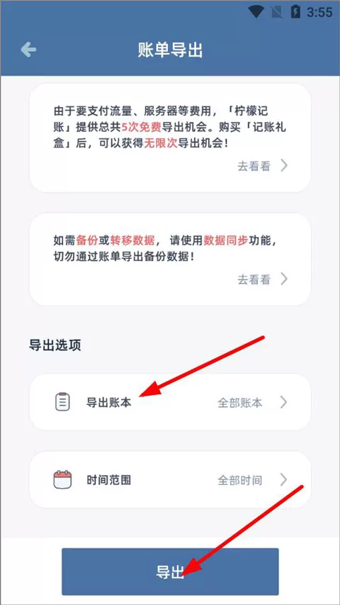 4、进入账单导出页面,导出选项包含导出账本和时间范围。点击“导出账本”,可在默认账本或已添加的账本中进行选择,选择完毕后,点击页面下方的“导出”按钮,就能记录数据。