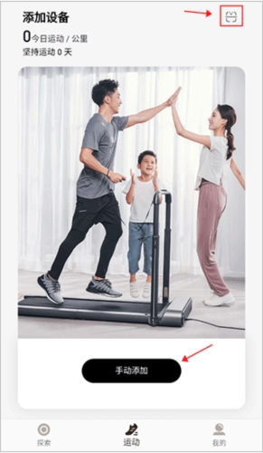打开软件后,在运动界面可以通过点击手动添加按钮,或者点击右上角的扫描框进行扫码添加。