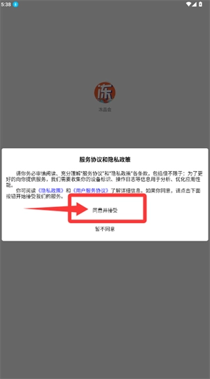 启动应用后,在协议与政策页面点击“同意并接受”即可进入。