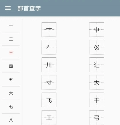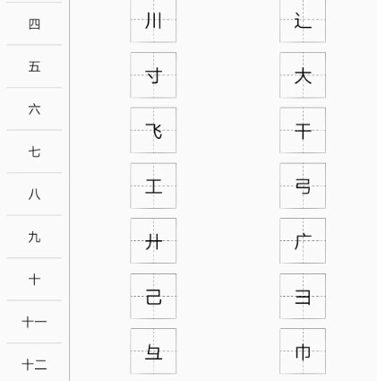 这个部首查字页面清晰有序,页面里的每个部首都遵循由简到难的顺序排列呈现。