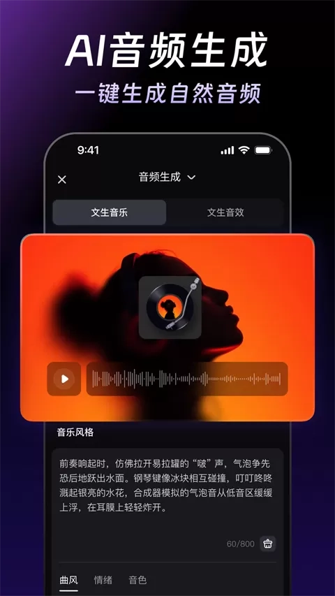 5、AI智能配乐:智能识别 + 文本调控,音画融合更自然
