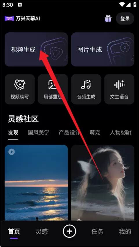 1、打开万兴天幕AI 后,进入首页,点击【视频生成功能】,即可开启AI视频创作之旅,快速将文字或图片转化为精彩视频。