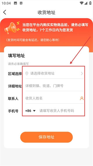 请按顺序填写【区域选择】【详细地址】【联系人】【手机号】这几项内容,所有信息填写完毕后就能保存该地址了。