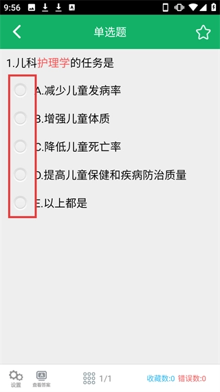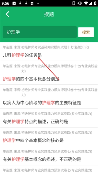 在搜题结果里点击题目,比如【儿科护理学的任务是】这一类,就能进入答题界面。
