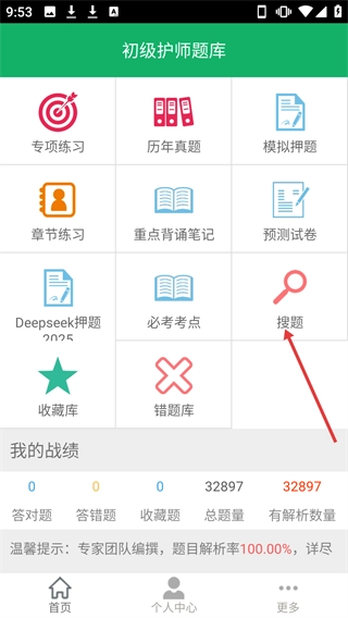在【初级护师题库】页面找到并点击【搜题】图标,即可进入搜题页面。