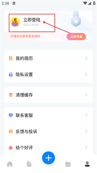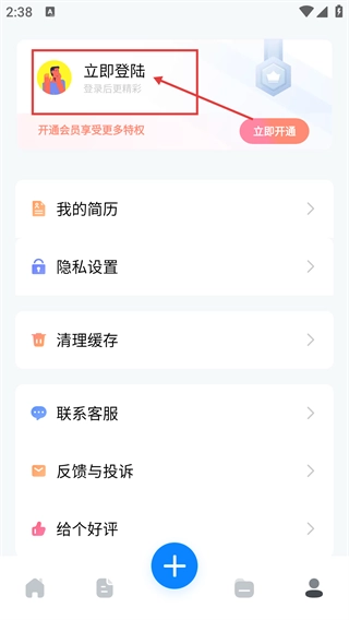 在个人中心页面,点击【立即登录】即可进入登录流程。此页面设有“我的简历”“隐私设置”等功能选项,并且支持会员开通服务。
