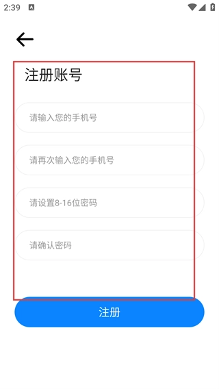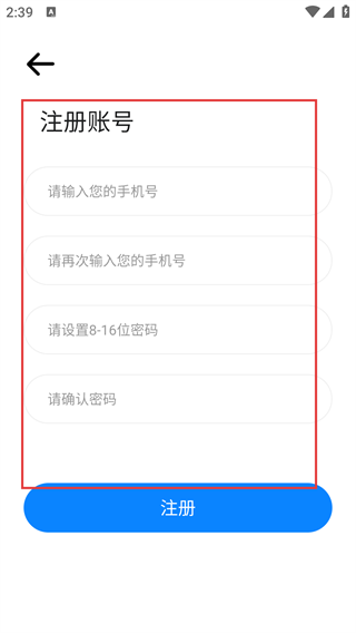 进入【注册账号】页面后,需按顺序填写手机号(需两次确认)、设置8-16位的密码(同样需要两次确认),全部完成后点击【注册】按钮,就能成功创建账号了。