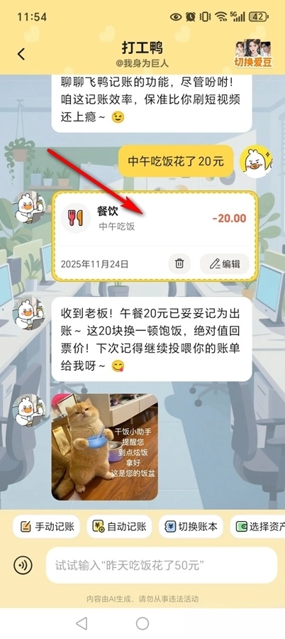 《飞鸭AI记账》是由合肥汇创星河科技有限公司开发的手机智能记账应用,具备AI聊天记账、语音记账、自动记账以及手动记账等多样化的记账模式。以AI聊天记账功能为例,用户只需通过与AI对话就能完成记账操作——比如说明“中午吃饭花了20元”,系统便会自动记录下对应的日期、消费分类和金额信息。