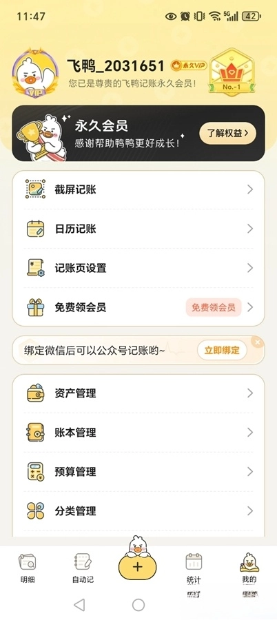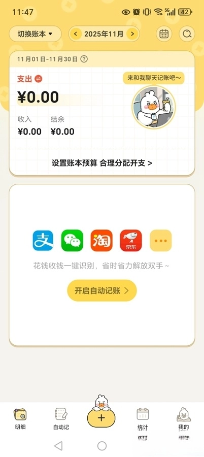 月预算、年预算可按需设置,系统会自动计算日预算,帮你合理把控花销,钱包余额由鸭鸭来守护!