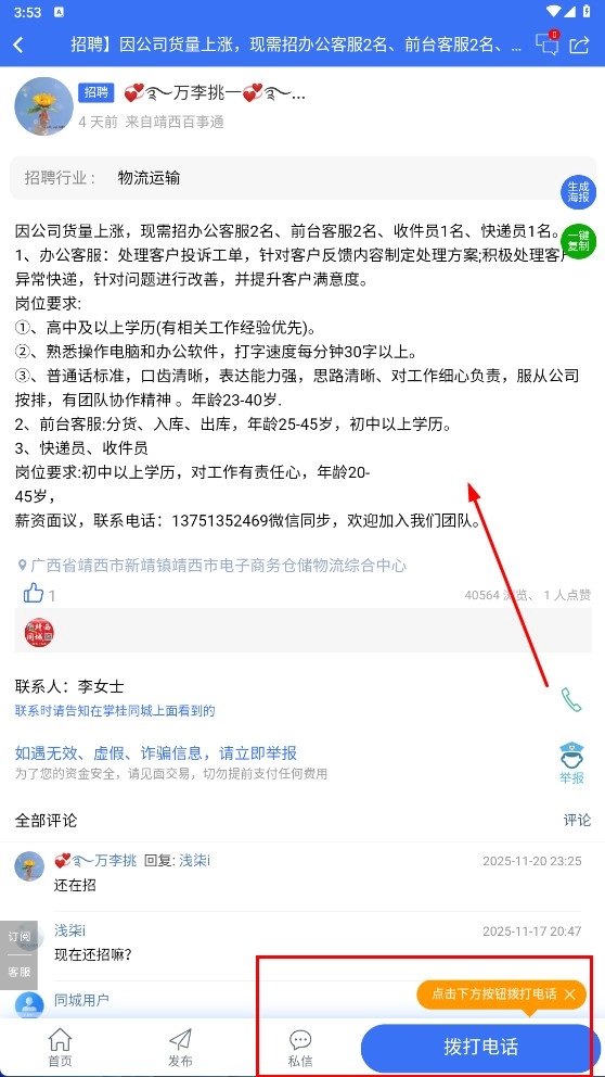 在招聘详情页面,可查看岗位要求、薪资待遇等相关信息,若对该岗位有求职意向,点击【拨打电话】按钮即可与招聘方取得联系。