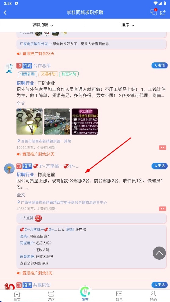 在求职招聘列表中,点击你所关注的招聘信息(例如物流运输行业的招聘信息),即可进入该招聘信息的详情页面。
