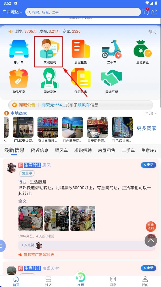 在首页找到并点击【求职招聘】图标,即可进入掌桂同城的求职招聘板块。