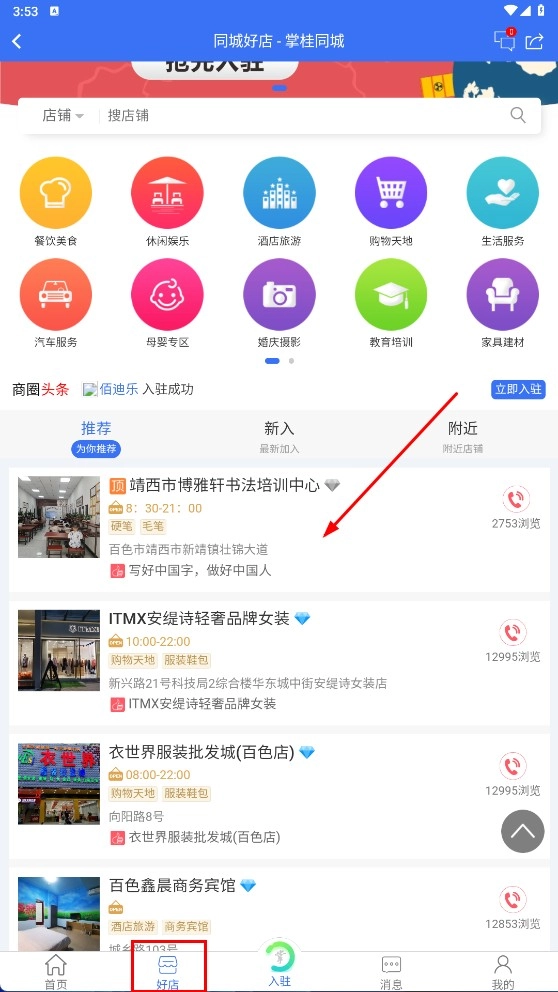 点击底部的【好店】按钮,就能进入同城好店的专属板块,在这里可以浏览餐饮美食、休闲娱乐等各种各样的店铺信息,还能及时了解本地商家的最新动态。
