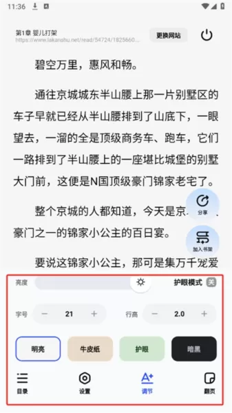 4、进入阅读界面后,可以根据阅读习惯调整字体的大小、背景等设置