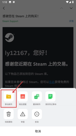 在未读邮件列表中,找到并点击Steam-Support发来的感谢购买邮件条目,进入该邮件的详情页面。