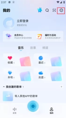2、切换到个人中心界面之后,可以查看到收藏、最近播放的音乐,接着选择右上角的齿轮图标进行点击。