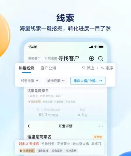 抖音销帮,由成都所见所得科技有限公司匠心打造,是一款极为出色的销售效率平台。它为广大用户带来便捷无比的办公辅助,让日常订单业务管理变得轻松自如,助力销售工作更上一层楼。 这款软件全方位覆盖销售作业全流程,提供客户线索、经营数据、业绩追踪、过程拜访等强大功能。不仅赋能BD科学管理客户资源,还助力管理者高效开展团队管理。 借助抖音销帮,还可深入进行数据分析,精准洞察客户线索。软件聚合海量线索,助力用户深度挖掘与追踪,将客户多方面信息多维度清晰呈现,个人经营状况一目了然,有效提升用户转化效率。 同时,抖音销帮极大增强了服务商对销售人员过程质量的把控能力,提升销售变现效率,优化销售人员办事效率,进一步深耕生活服务市场。 倘若你也心动,那就赶紧来体验这款软件吧!