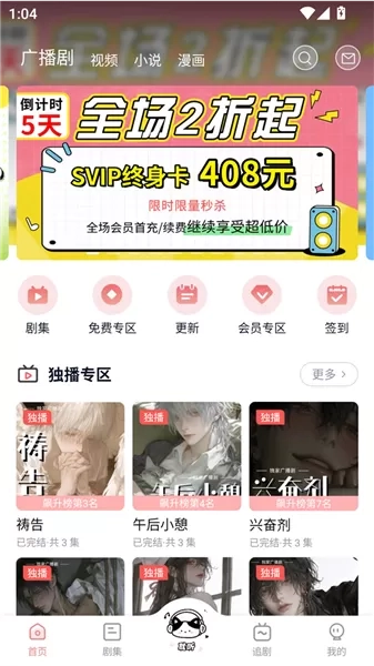 2、注册完成后来到首页,可查看系统推荐的广播剧、视频、小说和漫画。