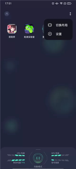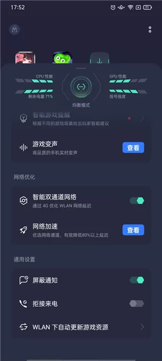 6、下方还为我们显示游戏的cpu性能、gpu性能、信号强度;