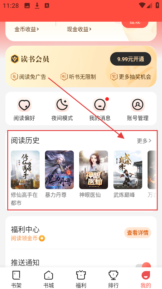在“我的”页面里,找到【阅读历史】这个板块,点击旁边的【更多】按钮,就能看到完整的阅读历史列表啦。