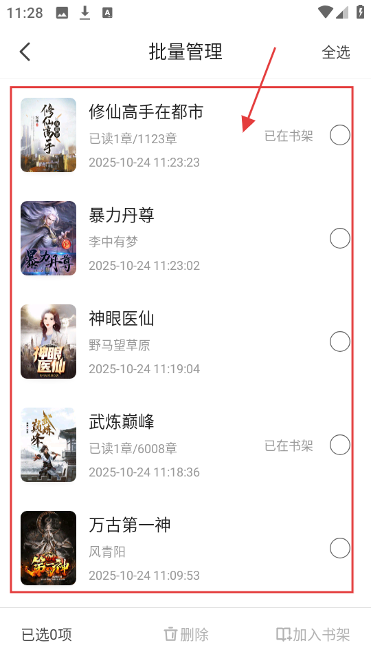 在批量管理模式中,您可以挑选需要操作的阅读记录,比如勾选《修仙高手在都市》这类小说记录呢。