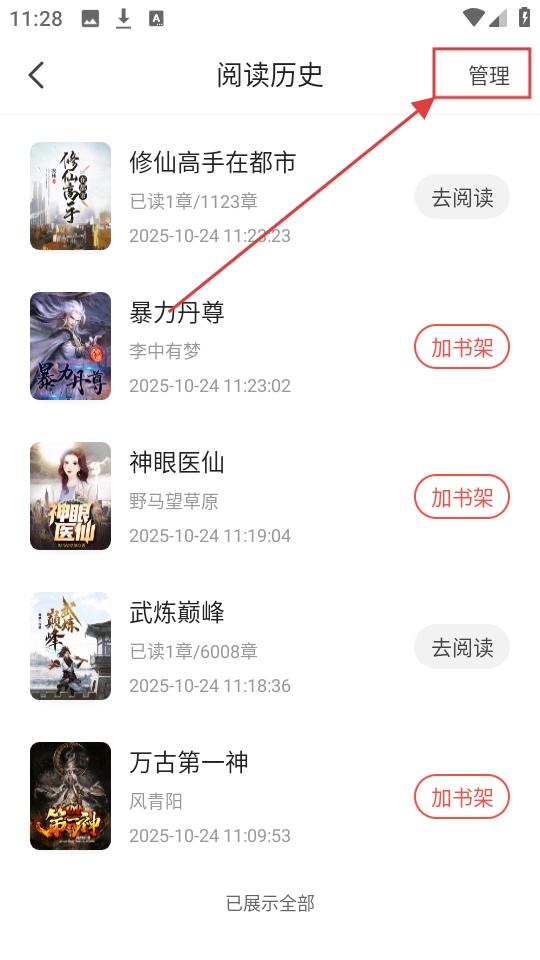 进入阅读历史列表后,点击右上角的【管理】按钮,就能开启批量管理模式,对阅读历史进行相关操作了。