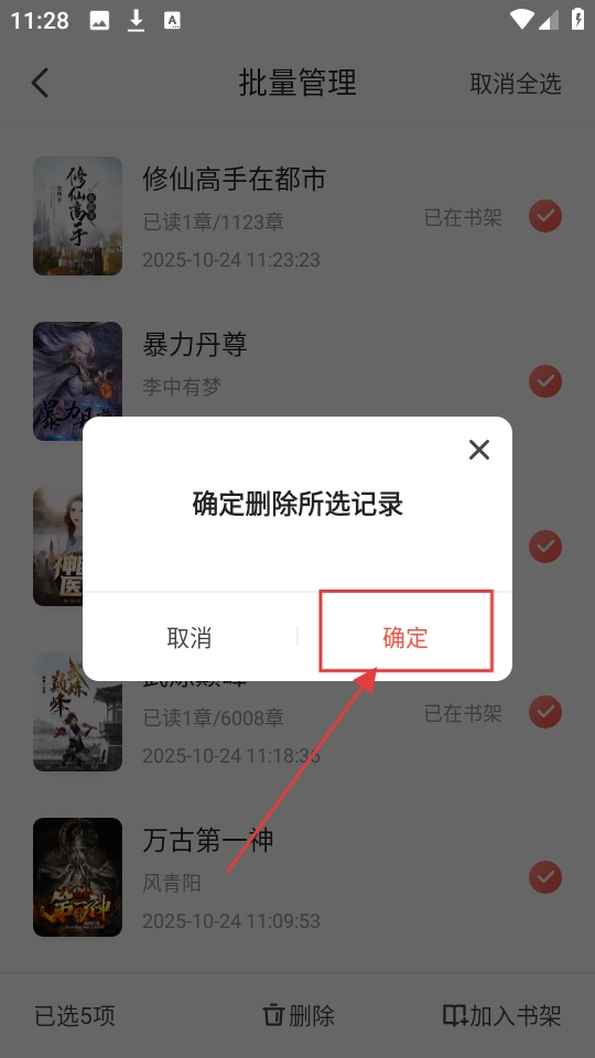 选好想要删除的记录后,系统会弹出确认提示框,点击【确定】按钮就能删除选中的阅读记录了。