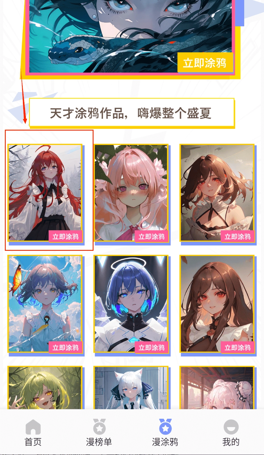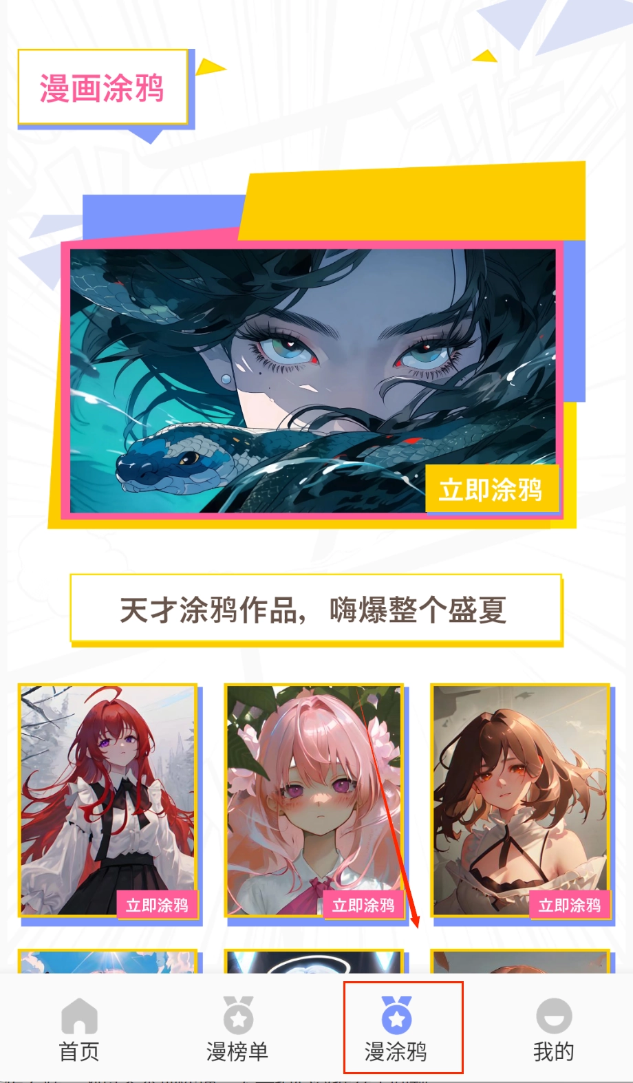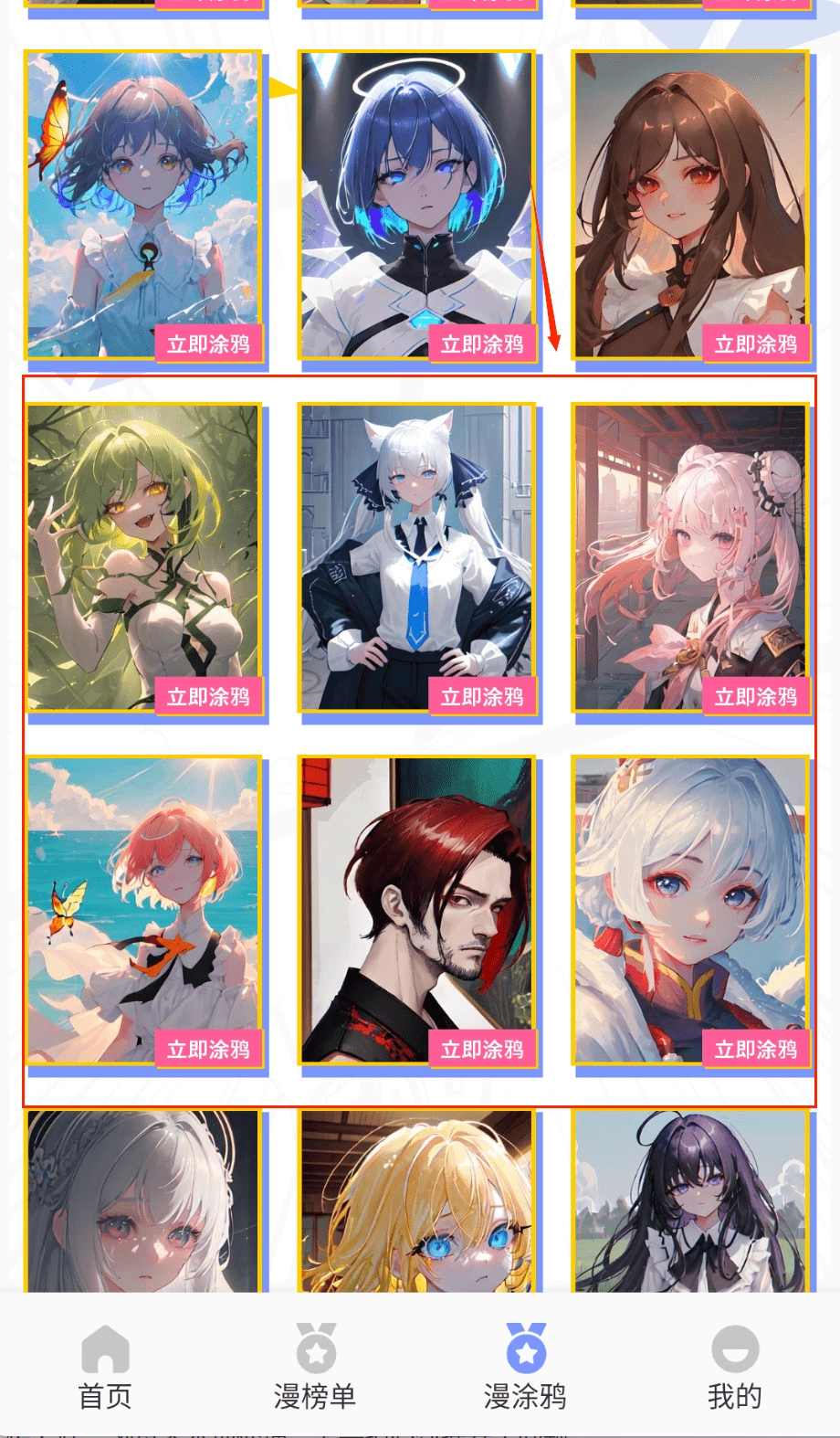点击底部导航栏的“漫涂鸦”即可进入创意功能区,这里陈列着各式各样风格的漫画线稿与模板,涵盖人物、场景等不同主题的创作素材。