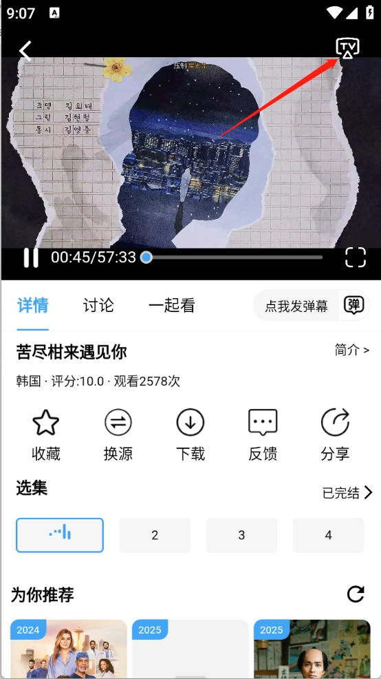 点击想看的影视进入播放页面点击右上角的“TV”。
