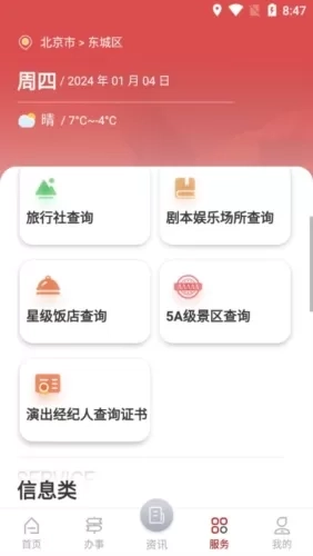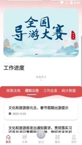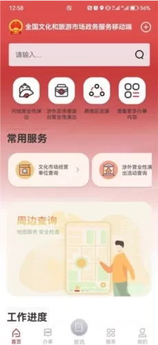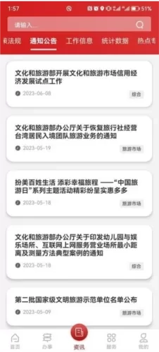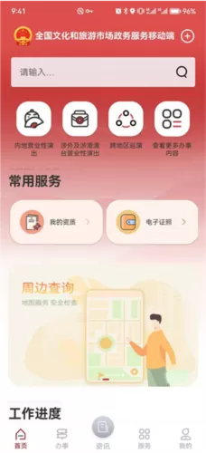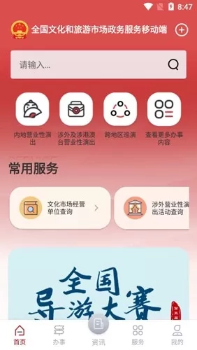 文旅市场通是一款由中华人民共和国文化和旅游部开发的旅游服务软件,它是专门面向国家文化领域及各级旅游部门打造的移动端政务软件,目的在于助力文旅局等相关部门更高效地推进文旅日常政务工作。在文旅市场通软件中,涵盖了政策资讯发布、行政审批办理、在线培训学习、电子证照应用等多项服务事项,同时为用户提供办理营业性演出、跨地区巡演等业务的入口,以及查询通知公告、办事进度等服务功能。