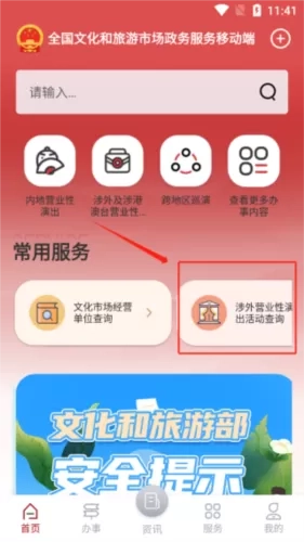 1、首先用户登录打开应用后进入首页,找到常用服务中的“涉外营业性演出活动查询”