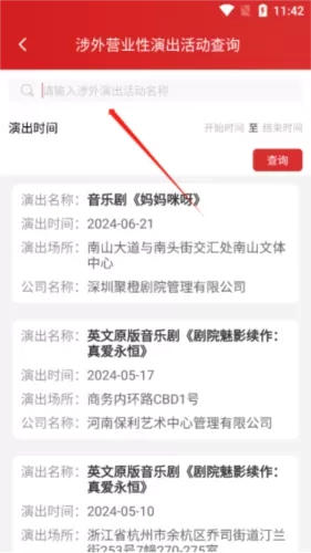 2、进入可以查询某一段时间的演出名称、场所、时间,也可以在搜索栏搜索演出活动的名称