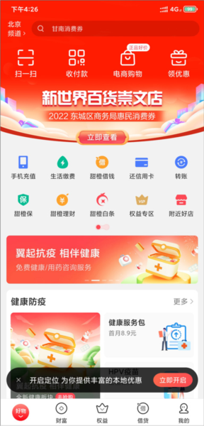5、理财业务:迈出理财一小步,开启人生新高度。借助添益宝(余额理财,收益实时可查)、定期宝以及基金超市,为客户打造兼具高达8.88%超高收益与高保障的理财服务。