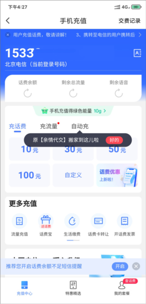 1、点击手机充值,进入翼支付,点击手机充值选项。