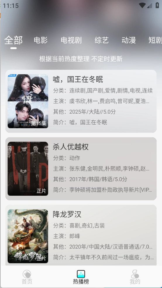 排行榜页面根据当前热度将影视实时排序。