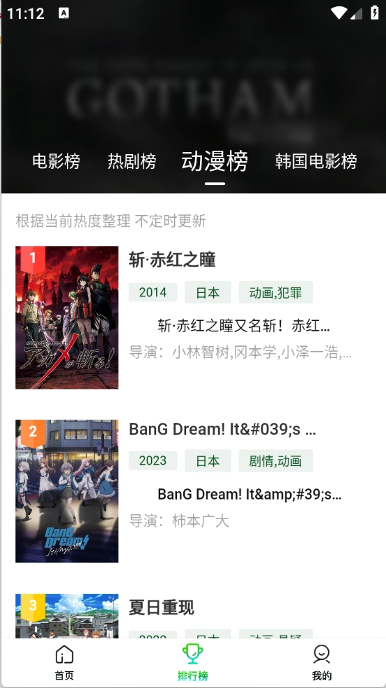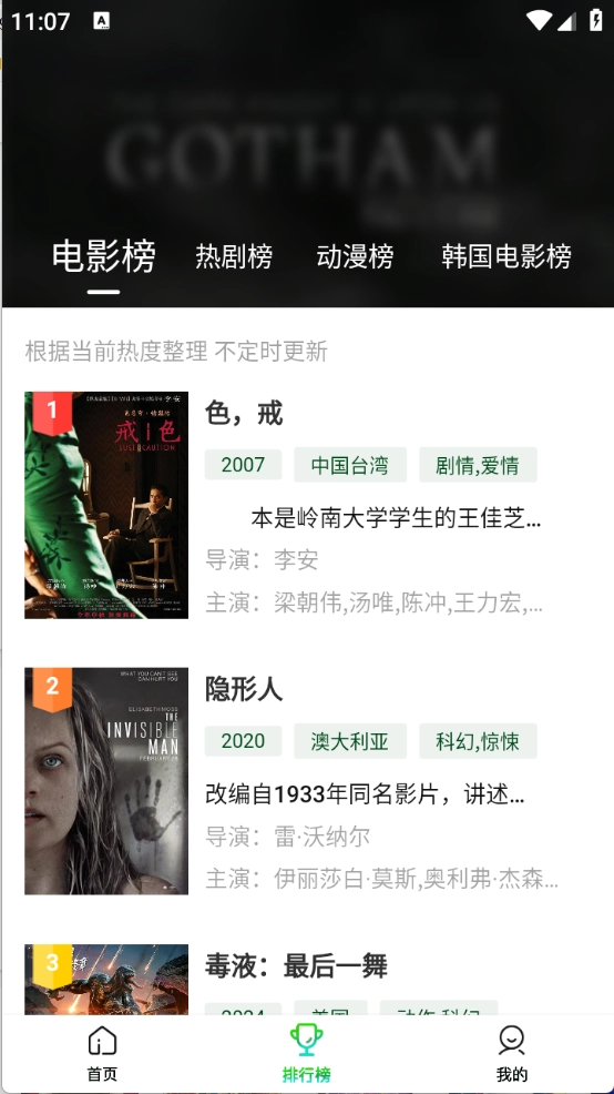 排行榜页面根据当前热度将影视进行了排序。