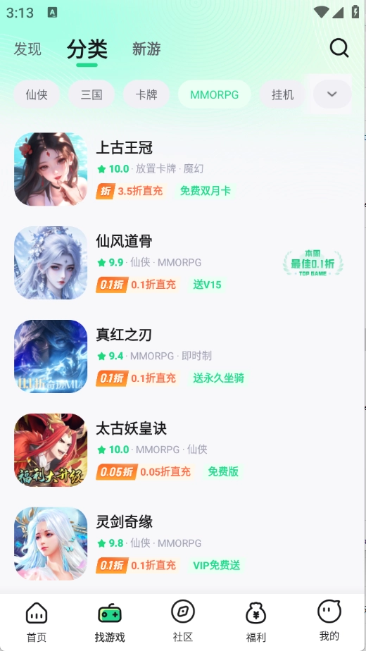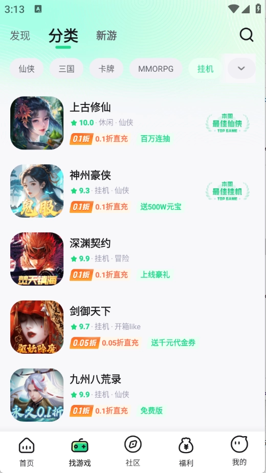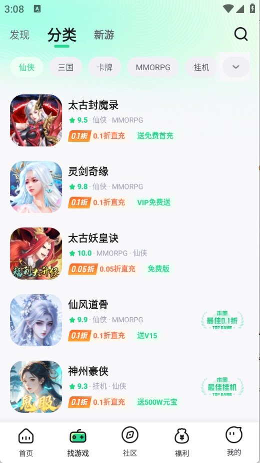 “找游戏”页面对游戏进行了细致分类,涵盖三国、传奇、卡牌等多种类型。